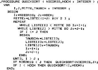 Wesentlich eleganter ist die Lösung in einer höheren Programmiersprache, die echte Rekursion ermöglicht. Dort gelten Variablen eines sich selbst aufrufenden Unterprogramms nur während der Ausführung dieses Programmteils. Die Prozedur zum Sortieren von 100 Integerelementen braucht bei meinem Pascal nur 4 Sekunden.