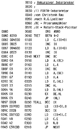 Christoph Rau, der Ihnen allen durch sein schönes Reversi-Programm bekannt ist, arbeitet ebenfalls an einer FORTH-Version. Seine entsprechenden Routinen sind um ein Erhebliches schneller, haben aber den Nachteil, daß die Register BC und IX ständig von diesen Routinen belegt sind und deshalb nicht anderweitig verwendet werden können. Hier die Arbeitsgeschwindigkeit in Taktzyklen:
