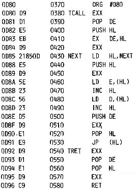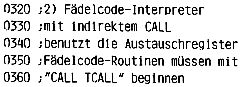 Die Routinen NEXT, TCALL und TRET bilden zusammen einen kleinen rekursiven Interpreter. NEXT ruft jeweils das nächste Unterprogramm auf (sowohl Maschinencode als auch Threaded Code) und ist somit die am häufigsten benutzte Routine. TCALL und TRET leiten jede Threaded-Code-Routine ein bzw. beenden sie. Es ist klar, daß die Arbeitsgeschwindigkeit des ganzen Systems hauptsächlich von der Geschwindigkeit dieser drei Routinen bestimmt ist. Hier die Arbeitsgeschwindigkeit der jeweiligen Routinen in Taktzyklen: