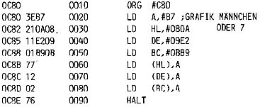 Der Pseudocode des Assemblers ORG #C80 (#↑=↑=Hex) bedeutet, daß das Programm bei C80 beginnt (Origin = Ursprung). In Zeile 90 ist ein Sprung (JP = Jump) nach der Adresse C82 eingetragen. Unter normalen Umständen erreicht das Programm also nie die Adresse C8D. Es ist nur für den Single Step Betrieb vorgesehen. Der Breakpoint E7 dient nur der Sicherheit. Wenn Sie das Programm mit E C80 starten, wird es bis zum nächsten Stromausfall die Register immer wieder mit FF laden.