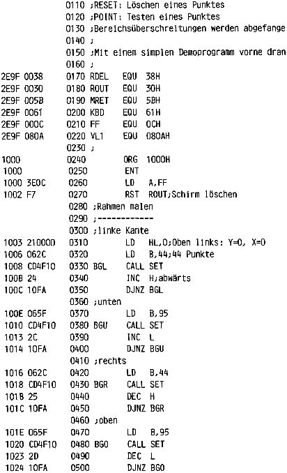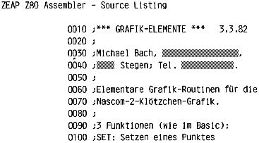 Nachdem ich die sehr empfehlenswerte 2732-Grafik von B.Ploss in meinen Nascom 1 eingebaut hatte, stellte ich fest, daß in BASIC zwar die Grafik schön ansteuerbar ist, für schnelle Bewegungen aber zu langsam. Also habe ich Assembler- Grafik- Routinen geschrieben, die ähnliches tun wie die SET, RESET & POINT in BASIC. Näheres geht aus dem beiliegenden Listing hervor. Eine Anwendung findet sich in meinem Spiel „Doppelwurm“. Es wäre schön, wenn jemand mal als nächstes VEKTOR programmierte, wofür ich folgende Parameterübergabe vorschlage: Endkoordinate in HL, Anfangskoordinate ist der Endpunkt beim vorherigen Aufruf. Carry Set bedeutet Vektor hellzeichnen, Carry gelöscht (durch OR A oder so) bedeutet dunkler Vektor (um einen neuen Vektor anzufahren). Diese Konvention im Gegensatz zur Übergabe der Anfangs- und Endkoordinate erleichtert das Zeichnen geschlossener Linien. Für eine einzelne Linie muß man VEKTOR allerdings zweimal aufrufen.