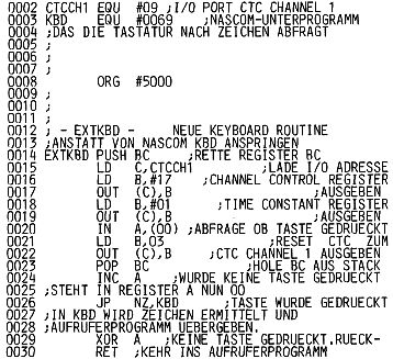 Das Programm EXTKBD wird anstatt der Nascom Monitorroutine aufgerufen. Der CTC wird initialisiert und gibt alle 16 Takte einen Impuls aus. Die CPU fragt den Zustand von Port 00 ab und kehrt, wenn keine Taste gedrueckt wurde, ins Aufruferprogramm zurueck. Wurde eine Taste gedrueckt, wird die Monitorroutine KBD aufgerufen und das Zeichen ermittelt.