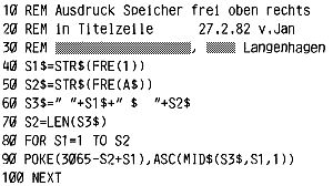 Das folgende Programm dient z.B. bei speicherresidenten Datei Programmen dazu, die Aufnahme weiterer Werte nicht erst dann beendet zu bekommen, wenn nach vielen Eingaben der Nascom einen OS-ERROR ausgibt. Es sorgt dafür, daß , als Unterprogramm eingesetzt, z.B. nach jeder Eingabe rechts oben auf dem Bildschirm der noch freie Speicherplatz für numerische wie Stringvariable angezeigt wird.