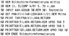 Soll eine Bildschirmausgabe innerhalb eines Programmes häufiger mittig (d.h. nach rechts und links gleicher Abstand) auf dem Bildschirm erfolgen, kann folgendes Unterprogramm eingesetzt werden. Die Zeilen 60 bis 80 dienen dazu, die Ausgaben alternativ zu festen Zeilenpositionen auszugeben.