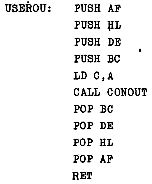 Das Hauptprogramm wird durch die Routine CONOUT (Console Output) dargestellt. Der auszugebende Charakter muß dieser Routine in Register C übergeben werden, d.h. das darzustellende Zeichen muß vor dem Aufruf von CONOUT immer in Register C gespeichert sein. (die Nassys Routine verwendet dazu Register A). Um irgendwelche Fehlfunktionen des Programmes zu vermeiden sollten außerdem vor dem Aufruf von CONOUT alle Register gesichert werden. Für die Benutzung mit Nassys I kann eine solche Ausgaberoutine z.B. so aussehen: