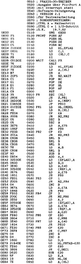 Das hier vorgestellte Programm arbeitet zwar im Interruptbetrieb, benutzt den Interrupt aber nur anstelle einer Warteschleife. Das Programm ist deshalb auch unter NAS-SYS-1 lauffähig. Interessant wäre natürlich eine Version, die einen echten Interruptbetrieb ermöglicht, wobei z.B. ein bestimmter Speicherbereich ausgedruckt wird, während der Computer gleichzeitig andere Aufgaben erfüllt. Eine solche Version wäre allerdings unter NAS-SYS-1 nicht lauffähig. Mehr darüber in einem der nächsten Hefte. Es wurde eine KBI-Belegung gewählt, die sich etwa für den MC-Texteditor oder ähnliche Aufgaben eignet. Eine besondere Funktion wurde den CTRL-Codes 1 und 3 zugeordnet. Sie erzeugen einen halben bzw. anderthalbfachen Zwischenraum mit Hilfe der Halbschrittfunktion. Damit erfolgte auch die Formatierung dieses Artikels.