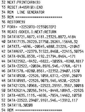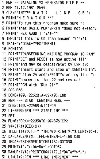 Im Programm Dataline ist folgende Philosophie enthalten: BASIC Programme sollen sich selbst während des Laufes verändern können; z.B Anfügen von DATA Lines, die Rechenergebnisse,Strings oder PEEK (DEEK) Inhalte beinhalten. Da während des Laufes eine Änderung des Programmes die Variablen-Felder löscht, werden die Änderungen in einen Buffer geladen, der sich am Ende der Exekution selbsttätig entleert. Für BASIC ist es so, als ob eine KBD Eingabe erfolgt. Es ist daher nötig, MEMSIZE zu begrenzen, um für den Buffer ausreichend Platz zu schaffen. Vielleicht fällt Ihnen auf, daß die Aktivierung und die Disaktivierung über SET und RESET erfolgt anstelle der sonst üblichen USR Funktion (ist nicht weiter bedeutungsvoll, war nur ein Versuch.