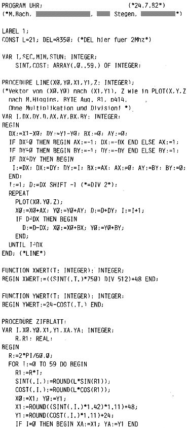 Wie ich dem neuesten INMC-News (das jetzt 80-Bus News heißt) entnommen habe, ist das BLS-Pascal, über das ich in den letzten Heften hier schon einiges geschrieben habe (wenn auch vom Nascompl-Formatierer heftig bekämpft), jetzt von Lucas Logic übernommen und in Nascom-Pascal umgetauft worden. Dazu kann ich nur sagen, daß dies eine gute Wahl war. Anbei ist ein weiteres Pascal-Programm, diesmal eine Uhr, d.h. es wird ein Zifferblatt mit sich bewegenden Zeigern dargestellt. Der Anblick ist zugegebenermaßen etwas kläglich, aber das kann jeder ja selbst verbessern (und hier veröffentlichen). Der eigentliche Leckerbissen dabei ist m.E. der „endgültige“ Vektor-Algorithmus: Die Prozedur „LINE“ zeichnet im Grafik-Mode eine bestmögliche Anpassung an die Verbindungslinie zweier Punkte, und zwar ohne daß eine Multiplikation oder Division nötig wäre! Eine einmalige Division durch 2 läßt sich mit dem SHIFT-Befehl beschleunigen. Da sonst nur Integer Addition- und Subtraktion vorkommt, ist dieser Programmteil sehr schnell; die Linie wird im Nu hingezaubert. Wegen der genannten Eigenschaften eignet sich dieser Algorithmus auch zur Progammierung in Assembler (in Verbindung mit den im Journal 2/82 p.27 veröffentlichten Assembler-Grafik- Unterprogrammen). Wer macht’s? Die Anregung zu diesem Algorithmus fand ich in BYTE Aug.81,p414 (M. Higgins). Für Basic-Anhänger, die dies auch ausprobieren wollen: PLOT(X,Y,Z) entspricht bei Z=1; SET(X,Y), bei Z=0: RESET(X,Y) und bei Z=2 wird der Helligkeitswert invertiert, Außerdem ist (0,0) in der Titelzeile, man braucht mit PLOT das lästige „Rumwickeln“ also nicht zu berücksichtigen.