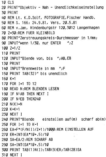 Im „Tiefenschärfe-Programm“ ist ein Fehler in Zeile 90. Durch Drücken der Enter-Taste alleine wird Z=0, und dadurch ergibt sich ein /0 Fehler(Divide by Zero). Man mußte folgende Zeile einfügen: