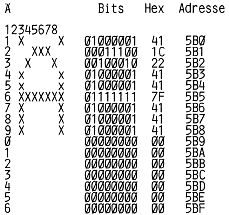 Will ich also selber einen Character ändern oder selbst erfinden, dann brauche ich nur ein 8 x 16 Raster aufzuzeichnen, für jeden Punkt, der dann am Bildschirm hell sein soll, ein X zu machen und dann jede Zeile in eine Bit-Information umzusetzen.
