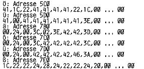 Das bedeutet, daß die Adresse eines Characters im ROM leicht zu finden ist: Die Row 1 des Buchstaben „A“ liegt z.B. auf Adresse ’410, die Row 16 auf ’41F. Man braucht also den ASCII-Code nur um eine Hex-Stelle erweitern und hat die Adresse des Buchstaben im ROM. Außerdem wissen wir schon, daß jedes „1“ Bit einen hellen Punkt erzeugt.