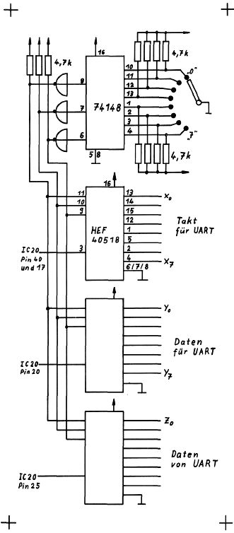 Will man mehrere Geraete an der UART betreiben die auch noch unterschiedliche Pegel und Baudraten haben, ist man gezwungen dauernd die Geraete umzustecken und Baudraten zu aendern. Die untenstehende Schaltung schafft hier Abhilfe . Der Prioiritaetsenkoder SN74148 liefert die Binaeradresse fuer die Multiplexer/Demultiplexer HEF 4051B. An den Eingaengen X0-X7 sollte der entsprechende Takt fuer die UART anliegen (z.B. IC31 Pin 1 fuer 2400 Baud ect.). Die aufbereiteten Daten zur UART werden an die Eingaenge Y0-Y7 angelegt (z.B. IC29b Pin 12 fuer den Kassettenrekorder). Die Ausgaenge Z0-Z7 leiten die Daten zu den entsprechenden Treibern (z.B. IC33b Pin 5 fuer den Kassettenrekorder). Durch hinzufuegen weiterer Multiplexer kann z.B. die Information Cass.-LED „ON“ umgeschaltet werden, oder Geraete ein und ausgeschaltet werden. Auch kann man wenn an einer PIO noch drei Bit frei sind das ganze per Software steuern.