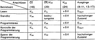 Die vorliegende Betriebsartenübersicht beschreibt den Zustand der Steuereingänge CE und OE/Vpp in der jeweils erwünschten Betriebsart.