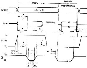 Wenn Adressen und Daten stabil anliegen, wird zuerst der Eingang OE/Vpp auf 25V vorbereitet. Durch einen Low-Impuls von ca. 50ms auf den Eingang CE erfolgt dann die Programmierung der eingestellten Adresse, wahlweise sequentiell oder einzeln. Mit OE/Vpp und CE auf Low-Potential kann eine Prog.-Kontrolle durchgeführt