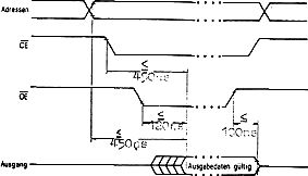 Im Zeitdiagramm sind die Bedingungen für die Chip-Enable- und Output-Enable-Eingänge (CE und OE) sowie max. Verzögerungszeiten für stabile Daten am Ausgang eingetragen, im Grunde nichts Neues.