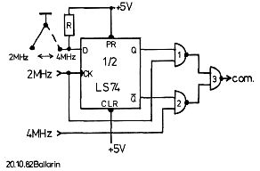 Es ist sehr nützlich wenn man 2 verschiedene Ctock-Frequenzen zur Verfügung hat. Diese Möglichkeit schufen wir uns durch eine kleine Modifikation auf dem NAS-Bufferboard, die dem beiliegenden Schaltplan zu entnehmen ist. Es kann natürlich auch zwischen 1 und 2MHz umgeschaltet werden. Die Schaltung wird an den Stellen angeschlossen, an denen sonst mit einer Drahtbrücke die gewünschte Frequenz gewählt wird. Die Umschaltung kann bei laufendem Programm vorgenommen werden (nur 100% sicher bei prellfreiem Schalter). Das zusätzlich benötigte IC wurde an einer geeigneten Stelle mittels beidseitig klebendem Band, Beine nach oben, befestigt. Stueckliste