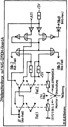 Um neben dem T4 und SYS1 auch noch das SYS3 einsetzen zu können, mußten wir uns überlegen, wo es am Einfachsten unterzubringen ist. Den beim Einsatz des SYS1 auf unserem Nascom1 entstandenen Hukepack wollten wir nicht noch vergrößern. Wir entschlossen uns, das SYS3 auf die N1-Karte zu stecken, und die 2 anderen Betriebs Systeme auf einem vorhandenen 12K NAS-Epromboard„A“ unterzubringen. Die erforderliehen Änderungen können dem beigefügten Schaltplan entnommen werden. T4 wurde auf den Block2, SYS1 auf Block3 gelegt. Block1 kann wie bisher beliebig verwendet werden. Bei jedem Block werden jeweils nur die beiden unteren Fassungen belegt, die oberen 2 bleiben leer. Für die Erweiterung ist auf der Platine genügend Platz vorhanden. Die beiden erforderliehen ICs sowie Relais wurden unterhalb des Adressier-Feldes mittels beidseitig klebendem Band, Beine nach oben, befestigt. Es ist darauf zu achten, dass das MEMEXT-Signal auf keiner anderen Zusatz-Karte erzeugt wird. Zum Betrieb der Relais sollten nicht die im Nascom verwendeten Spannungsqellen benutzt werden. Wir haben die für die RS 232-Schnittstelle vorgesehenen −12V vor dem U-Regler angezapft. Auch die Masseseitige Zuleitung sollte direkt an dieser, und nicht an irgend einer anderen Stelle der Masseleitung angeschlossen werden. Zusätzlich sollten parallel zu den Relaisspulen Schutzdioden angebracht werden (für die Betriebsspannung in Sperrichtung). Wird das System nur mit 2MHz betrieben, so können auch LS-ICs verwendet werden.