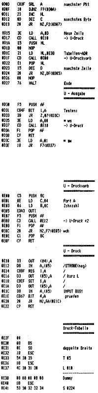 Im folgenden zwei Programme zur Druckausgabe des TV-Bildes mit verschiedenen Druckern. Klaus Mombaur programmierte in Maschine für einen ITOH , Clemens Ballarin in Pascal für einen MX Drucker. Die Beispiele wurden mit einer Maßangabe versehen, um einen Größenvergleich zu haben. Vergleichen Sie dazu noch die Ausgabe meines Selbstbau-Plotters (steht immer noch zum Verkauf), die in etwa die richtigen Seitenverhältnisse zeigt.