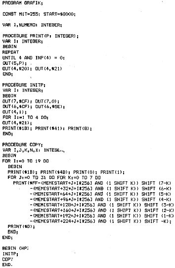 Beide Programme sind natürlich leicht auch in Basic zu formulieren, nur geht es dann mit TV-PLOT auch sehr langsam (MEM(x) ist ein Pseudo-Zahlenfeld, mit dem byteweise direkt der Speicher gelesen bzw. beschrieben werden kann; MEM($xxxx):=$yy entspricht also POKE X, Y wobei X bzw. Y das Dezimaläquivalent von xxxx bzw. yy bedeuten (m.a.W.: in diesem Pascal werden Hex-Zahlen mit $xxxx und nicht mit 0xxxxH angedeutet).