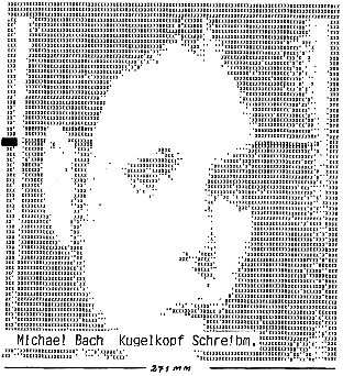 Um eine bleibende Darstellung des Bildes zu erhalten, bedient sich TV-DRUCK einer Schreibmaschine. Das Problem der Auflösung tritt hier natürlich auch auf, zur Abwechslung ist es anders gelöst: Nur Jede 2. Zeile wird gedruckt, und es werden horizontal immer 2 Punkte zusammengefaßt. Wenn beide hell sind, gibt’s nen „X“, bei einem von beiden ein „.“, sonst einen Leerschritt (CASE-Statement). Damit das Bild auf der Schreibmaschine erscheint, muß vor WRITE-Befehlen der USER-Vektor auf einen entsprechenden Treiber zeigen und „U“ aktiviert sein. Bei mir liegt der Schreibmaschinentreiber bei B300H. „U“ wird aktiviert, indem die OUT- Tabelle mit (0C73H)<—78H umgeschaltet wird (dies ist glaub ich Nassys3- spezifisch). Hinterher wieder abschalten nicht vergessen. Das Ausdrucken eines Bildes dauert sehr lange (> 1/2 Stunde) wenn man keinen flotten Matrixdrucker hat, aber wenn man den hat, kann man das Bild mit Einzelpunktansteuerung sowieso direkt darstellen.