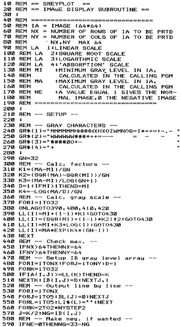 Das Programm Greyplot drucken wir jetzt schon ab, da es gut zu unserem Thema „Druckausgabe“ paßt. Manche Leser können vielleicht schon so etwas mit dem Unterprogramm anfangen. Es druckt Intensitätswerte als Graustufen ab. Gerhard Klement hat damit den Ablauf einer Sonnenfinsternis in Indien dokumentiert. Sicher schickt uns G. Klement aber noch ein aufrufendes Programm zur erläuterung dazu, möglicherweise mit Bildmaterial zur Demonstration. Falls das TV-Interface bald auch auf Graustufen anwendbar wäre, könnte dies das ideale Programm zur Druckausgabe werden.