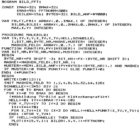 Das ganze könnte also ein interessanter Baustein eines Bildverarbeitungs- oder Zeichenerkennungssystems sein. Probleme: Wegen der Darstellung in großen Zahlenfeldern (reell- und imaginär-Anteil separat) wird viel Speicherplatz gebraucht. Da könnte man aber noch etwas tricksen. Ferner dauert es doch fast 10 Minuten (bei 4MHz) bis das Bild einmal hin- und dann wieder zurücktransformiert ist. Das liegt nicht zuletzt an der ständigen Benutzung 2-dim. Zahlenfelder, dies ist notorisch langsam. Viele Möglichkeiten für Maschinenkode-Beschleunigung: Das Umkopieren der Zeilen- bzw. Spalten; oder überhaupt die ganze Fourieranalyse (dafür gab’s mal in Byte ein 6800-Maschinenprogramm). Also für interessierte „Bild-Verarbeiter“ ein weites Feld.