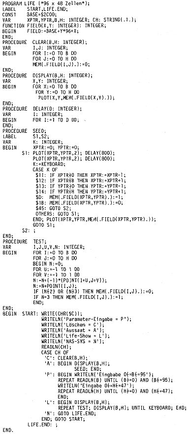 LIFE braucht man wohl nicht mehr vorzustellen. Das besondere an dieser Version ist die Verwendung der 96*48-Semigrafik des Nascom-2-Zeichengenerators und die Programmierung in BLS-Pascal. Es lassen sich also wahlweise bis zu 4608 „Zellen“ auf dem Bildschirm darstellen („Breite“ und „Höhe“ des Feldes kann vorgegeben werden); das sind 12 mal soviel wie mit der Maschinensprachenversion, die im Nascom-Journal vorgestellt wurde. Natürlich geht das alles dann etwas langsamer (ca. 2 Bilder/Minute bei 4608 Zellen). Wer’s eilig hat, kann ja auch ein kleineres Spielfeld wählen. Sehr organisch sieht das ganze auch nicht aus, aber es entstehen interessante geometrische („Klötzchen“-)Strukturen. Das Programm ist auch als Alternative zu den Abschußspielen in diesem Heft gedacht, aber wer nicht aufpaßt, kann das ganze Programm abschießen. In der vorliegenden Fassung muß es mit dem „T“-Befehl nach 2180H compiliert werden, andernfalls muß die Adresse BASE angepaßt werden.
