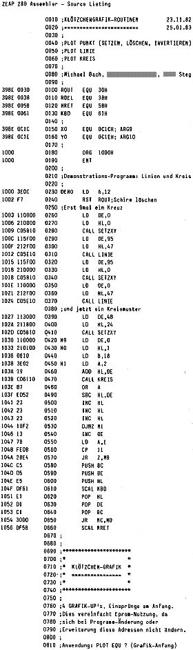 Unterprogramms 6 Stackplätze als RAM benutzen. Die Variablen (bzw. der hoch- und niederwertige Teil getrennt) erhalten symbolisch den Offset zum Indexregister. Den logischen Variablen NEGX &sw. ist jeweils 1 Bit im Byte FLAGS zugeordnet. Das erklärt die lange Latte von EQU’s am Anfang von LINIE. Eine Macke (mindestens) ist in meinem Programm noch drin: Wenn man eine Linie vom Negativen ins Positive plotten will klemmt’s. Wer sagt mir, woran es liegt? KREIS: Als Parameter wird der Radius in HL übergeben, der Mittelpunkt muß vorher mit SETX0Y0 gesetzt werden. Auch hier wird der Stack als Variablen-Speicher benutzt. Der Kreis-Algorithmus stammt ebenfalls aus der genannten Quelle, ich schreibe ihn hier nicht hin, weil er in meinem demnächst kommenden Pascal-Programm „Very-Tiny-CAD“ drin ist, Bemerkenswert ist noch folgendes: Der Maßstab der X- und Y-Koordinaten ist unterschiedlich und auch vom verwendeten Monitor/ Femseher (das einzig Vernünftige was man mit einem Fernseher anfangen kann: a) abschalten oder b) einen Video-Eingang einbauen und als Monitor benutzen) abhängig. Bei mir muß der Y-Wert mit ca. 0,75 multipliziert werden damit’s ’nen Kreis gibt. Wie macht man das in Assembler? Nun, 0,75=3/4. Multiplikation mit 3: X*3=X*2+X; und die Division durch 4 kann mit zweimaligem arithmetisch rechts Schieben erreicht werden. Dies wird im Unterprogramm SCALE erledigt, das nur beim Zeichnen eines Kreises benötigt wird. Nun, so gegen Schluß hin ist das Tempo zunehmend schneller geworden. Hoffentlich hat’s dennoch einen Sinn gehabt das Programm so auseinanderzuklamüsern.