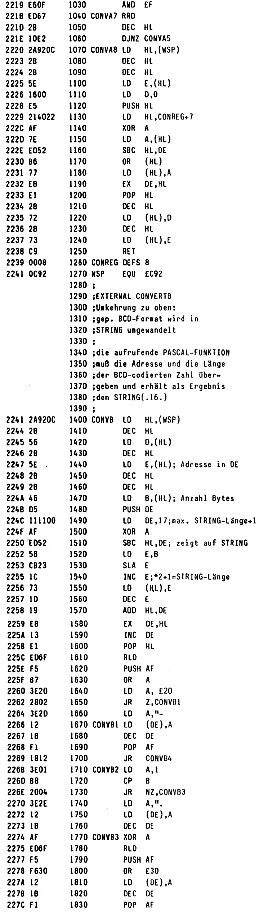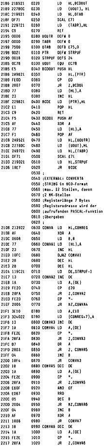 David Kastrup hat uns davon in Kenntnis gesetzt, daß im BLS-Pascal die Funktion MOD bei negativen Zahlen versagt. Abhilfe kann man (bei der Cassettenversion) dadurch schaffen, daß man ab 1964H drei Bytes ändert in D0 18 ED.