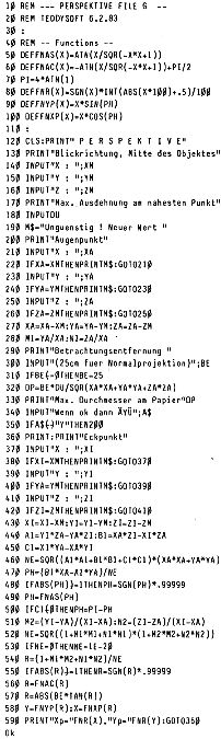 Gerhard Klement hat uns ein „einfaches“ Perspektive-Programm geschickt. Um die Funktion zu demonstrieren, hat er das Programm WÜRFEL (Seite 27 in diesem Heft) mit vielen Kommentaren versehen. Hierzu ist ein Vergleich mit dem 3-D-Programm von Michael Bach (Seite 6) recht reizvoll.