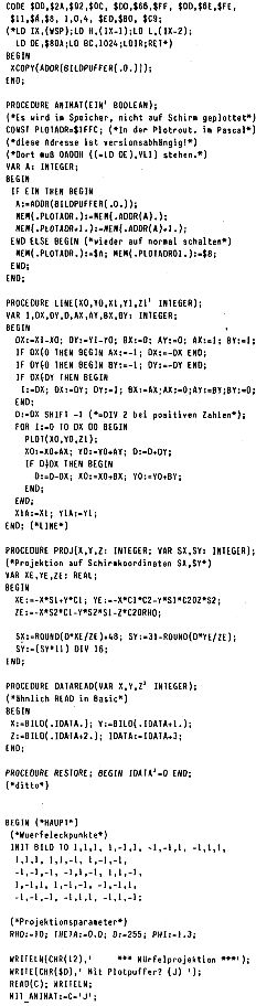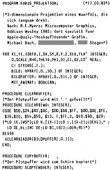 Nun zum heutigen Pascal-Programm: Ein dreidimensionales Gebilde (hier ein Würfel) wird auf die Bildschirmfläche projiziert; ein Betrachtungswinkel wird geändert und wieder projiziert, wodurch eine (ruckweise) Drehung zustande kommt. Als Spezialität (und deutliche Verbesserung) besteht noch die Möglichkeit, einen Puffer für die Bildschirmseite zu benutzen, in den der Würfel erst ’mal gezeichnet wird; dann wird der Puffer „blitzartig“ (mit einem Maschinenprogramm das LDIR benutzt) zum Schirm kopiert; diese Methode hat Herr Klement neulich als „Animation“ in seinen Programm „Swinghouse“ erwähnt. In der vorliegenden Form funktioniert das nur mit der RAM-Version des Pascal, und zwar indem in der Plotroutine der Bildschirm-Offset geändert wird. Am besten sollte die Frage nach den Puffer erstmal nicht mit „J“ beantwortet werden. Näheres ersieht man aus dem Programm. Im nächsten Journal erfolgt dann eine Erweiterung dergestalt, daß nicht sichtbare Kanten des Gegenstandes verdeckt werden („hidden line elitmination“).