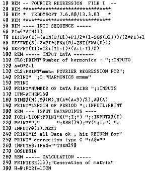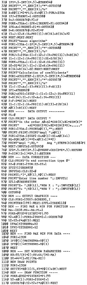 Bedingt durch das Aufzeichnungsverfahren hatte ich bei einer Sonnenfinsternis Messwerte, die nicht aequidistant waren. Eine weitere Erschwernis war, dass die Messwerte stark streuten. Ich war also gezwungen, von einer Fourier Analyse abzugehen und musste mir eine Regression schreiben, die natuerlich viel langsamer laeuft, aber dafuer Messwerte mit beliebiger Phasenbesetzung verarbeitet. Es ist beim Gebrauch darauf zu achten, dass mehr Messwerte als Freiheitsgrade vorhanden sind. Waehlt man beispielsweise eine sehr hohe (noch zulaessige) Anzahl von Oberwellen und draengt die Messwerte in der Naehe eines Phasenpunktes zusammen, dann sieht man zwar einen guten Fit der Messwerte, aber im freien Bereich beginnt die rueckgerechnete Kurve wild zu schwingen. Wenn Interesse besteht, schicke ich ein Programm mit einer Lagrange Interpolation, bei der das schoen zu sehen ist.