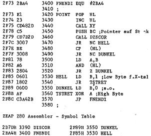 Wie im letzten Heft versprochen, liefern wir hier die POINT Routine , die Michael Bach freundlicherweise zur Verfügung stellte, zur Erweiterung des X-tal BASIC. Ein Fehler ist im Listing von SET und RESET noch zu korrigieren. Da der Akku in einer der X-tal Routinen verändert wird, darf er erst nach Aufruf von XY mit dem Parameter für Setzen oder Löschen geladen werden. Die Programmzeilen sind also einfach zu vertauschen.
