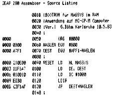 Der MC CP/M Computer schaltet um zwischen 4K ROM und den 64K RAM. Aus diesem Grund kann ich ohne Hardwareänderungen (die ich aus verschiedenen Gründen nicht durchführen wollte), nicht das Prinzip von Günter Kreidl nachvollziehen, der Nassys im EPROM hat, und dieses nach Bedarf ein- und ausblendet. Bei mir muß Nassys im RAM laufen (denn ich benötige den Platz von 800 bis FFF als Bildschirm- bzw. Arbeitsspeicher und kann ihn nicht durch das EPROM belegen). Wenn das B-DOS von Helmut Emmelmann soweit ist, wird man wohl dieses Programm nach dem Einschalten des Rechners ins RAM booten und dann per Diskette Nassys (oder jedes beliebige Betriebssystem) laden. Im Augenblick soll aber Nassys nach dem Einschalten sofort verfügbar sein. Dies erreiche ich durch nachfolgend abgedrucktes Boot-Programm, das in einem 2732 abgelegt ist.