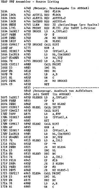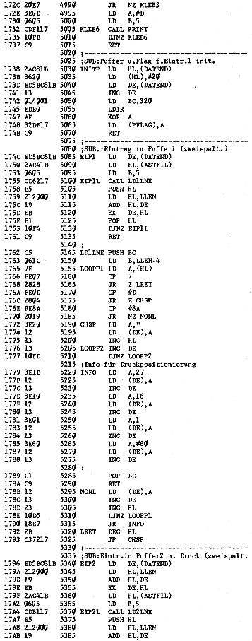 Es speichert seinen Zustand nach dem Aufruf in der Adresse PFLAG. Dabei bedeutet 00, daß das Programm den Puffer (er wird automatisch immer ans Dateiende gelegt) gelöscht hat und beim nächsten Aufruf den Record in Puffer 1 einträgt. FF zeigt an, daß Puffer 1 bereits vollgeschrieben ist und nun Puffer 2 gefüllt und danach der gesamte Puffer ausgedruckt wird.