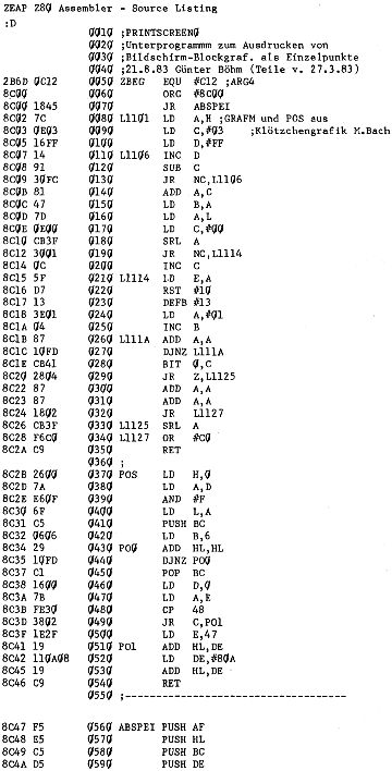 Das Programm PRINTSCREEN0 gibt einen Bildschirm mit Blockgrafik auf einen Matrixdrucker aus, wobei jedes Klötzchen als Punkt gedruckt wird. Die Beispiele bei „Massivkörperprojektion“ und das Titelbild in diesem Heft sind mit diesem Programm ausgedruckt.