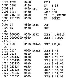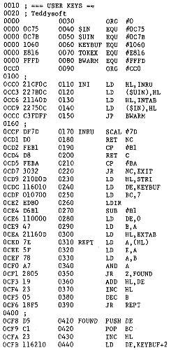 Die Initialisierung veaendert den Input Vektor, der nunmehr auf die User Routine INROUT weist. In dieser wird geprueft, ob eine Zifferntaste zugleich mit der Graphic Taste gedrueckt ist. Ist dies nicht der Fall, erfolgt eine sofortige Rueckkehr zu BASIC. Andernfalls wird der Keyboard Buffer geloescht, das RUN Token eingeschrieben und -je nach gedrueckter Taste- die entsprechende BASIC Line number in der EXTAB errechnet, die ebenfalls in den KBUF geladen wird. Nach Adjustierung des Stackpointers wird die Token- E Execution Routine aufgerufen, und BASIC laeuft normal weiter.