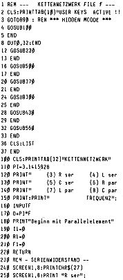 Kettennetzwerk ist eine praktische Nutzanwendung, ein Programm, das Impedanzen von Netzwerken errechnet. Als erstes Element muss ein Parallelelement eingegeben werden. Die Schaltung wird dann via Eingabe weiter aufgebaut, wobei die Impedanzen fuer jede Aufbauphase angezeigt werden. Zum Testen vielleicht zuerst eine einfache Schaltung aus Parallel- und Serienwiderstaenden versuchen.