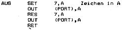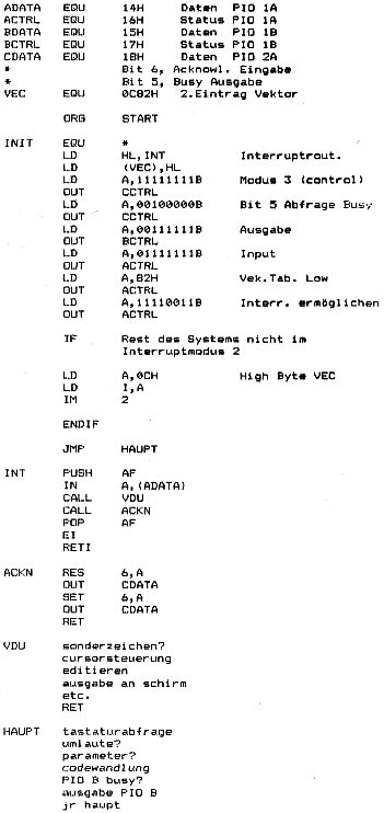 sogenannter Apple kompatibler Platinen bot sich eine preisgünstige Möglickeit an, wenn man schon vorhandene Nascomteile mit einschließen kann. Die Tastatur des Apple (oder besser die Dekodierung auf der dazu gehörenden Platine) ist nicht sehr attraktiv, man kann auf sie verzichten. Die Verbindung zur Hauptplatine entspricht nämlich einer 7-Bit ASCII Schnittstelle. Hier kann also bequem der Nascom über eine PIO angekoppelt werden. Der Apple erkennt ein anstehendes Zeichen an einer Flanke (steigend oder fallend). Die PIO wird auf Ausgabe gesetzt, die Ausgaberoutine kann so aussehen: