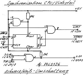 Oben erwähnte Synchronisation von CPU und Videoteil wird durch die Ausgabe von WAIT-Zyklen gewährleistet. Da der Prozessor warten muß, bis der Videoteil eine neue Zeile eines Zeichens in das Schieberegister zur seriellen Ausgabe geladen hat, ist die Geschwindigkeitseinbuße auch bei häufigem Bildschirmzugriff kaum meßbar.