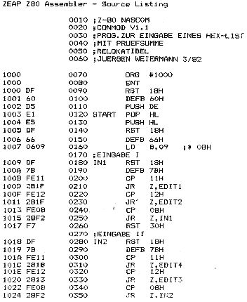 Hier noch eine verblueffend einfache Aenderung, gefunden von Herrn oligmueller.Durch die Aenderung von 3 Bytes(im Assembler-Listing mit einen „*“gekennzeichnet)auf die entsprechenden,im Listing aufgefuehrten Werte laesst das Programm auch eine Eingabe ohne Pruefsumme zu.