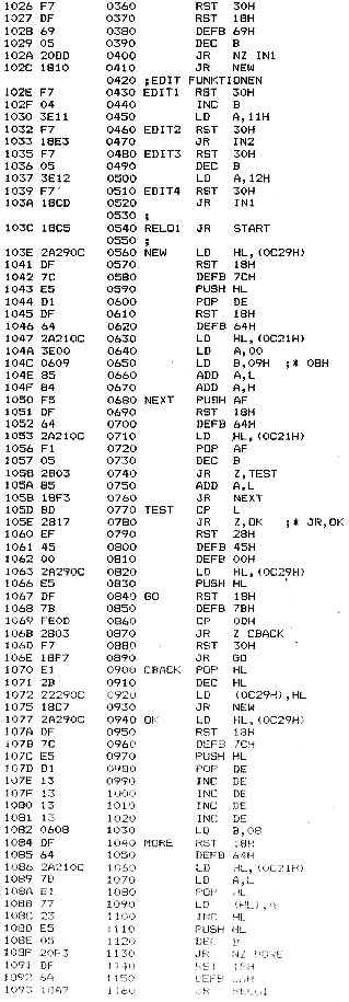 Hier nun des Ergebniss: INLINE wird ersetzt durch eine Schleife um DF 7BH aus der man nur durch Eingabe von 0DH herrauskommt(Achtung:nur däe aktu.Zeile kann editiert werden).Damit waere das erste Problem beseitigt.Die Beseitigung des Backspace-Problems ist noch einfacher:in den jeweiligen Eingabe-Routinen wird BS auch erkannt und ignoriert.Ich hoffe,dass diese Aenderungen dazu beitragen koennen,dass die Eingabe von Hex Listings einfacher geworden ist.