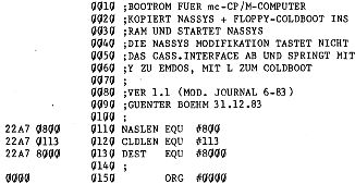 Das Cold-Boot Programm (wie erwähnt für beide Formate), ist im EPROM abgelegt oder wurde (wie in meinem mc-System) nach Einschalten oder Reset ins Ram kopiert. Es gäbe die Möglichkeit, ohne residenten Monitor nach dem Einschalten des Rechners das Betriebssystem direkt durch den Cold-Booter von der Diskette zu laden. Wenn nun aber irgend ein Fehler auftreten sollte, sind Sie ohne Monitor völlig hilflos bei der Fehlersuche. Deshalb empfiehlt es sich, auch einen (wenn auch kleinen) Monitor zur Verfügung zu haben. In meinem Fall (siehe Heft 6/83) stehen 4K EPROM zur Verfügung, in die Nassys und der Cold-Booter bequem hineinpassen. Bei der Nascom Grundplatine, die ja nur 2K EPROM ab 0000H faßt, sollte man vielleicht auf den alten Monitor T2 zurückgreifen und in den zweiten Sockel den Cold-Booter stecken. Für Besitzer der verschiedenen RAM/EPROM- Karten ergibt sich vielleicht eine andere Möglichkeit, neben Nassys noch einen EPROM- Platz freizuhalten, der später ausgeblendet werden kann.