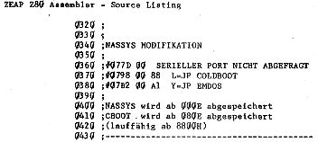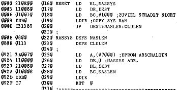 Ich für meinen Fall habe Nassys3 so geändert, daß mit dem Drücken von „L“ der Cold-Booter angesprungen wird. Im folgenden nochmals die Routine, die Nassys3 und den Cold-Booter aus dem EPROM ins RAM lädt, Nassys auf 00 zurückkopiert und Nassys initiiert.