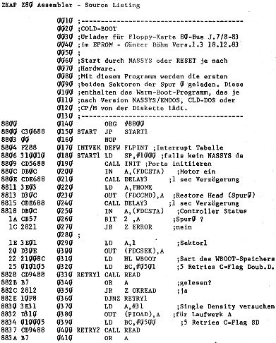Wir wollen also eine Routine im EPROM haben, mit der wir ohne „fremde Hilfe“ von der Diskette lesen können. Diese recht kleine Routine sei hier „Cold-Booter“ genannt. Sie erkennt automatisch, ob es sich bei einer eingelegten Diskette um Single oder Double Density handelt, und liest (immer nur von Laufwerk A) die ersten beiden Sektoren der Spur 00. Die Routine kann auf jedem Z80-Rechner laufen und ist von keinem Betriebssystem abhängig (wenn man die Fehlermeldung, die die Nassys-Breakpointroutine benutzt, durch HALT ersetzt).
