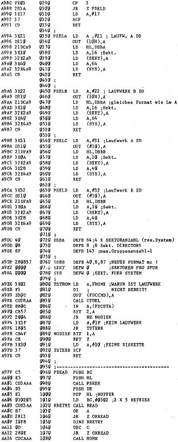 In die Select-Routinen zur Auswahl der Laufwerke wurden noch zwei Abspeicherungen für die Anzahl der Sektoren pro Spur und für die Sektoren pro Systemspuren aufgenommen, damit die Umrechnung von logischen zu physikalischen Sektoren (ab Zeile 1490 ebenfalls geändert) für jedes Format durchgeführt werden kann. Bisher setzte die Umrechnung 30 Sektoren für das System voraus. Beim neuen Format mußte das geändert werden: