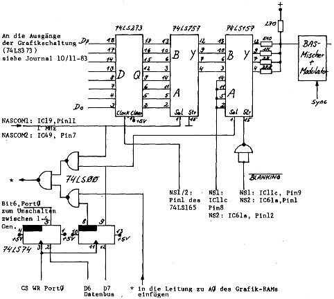 Der Zeichengenerator des Nascom1 hat keinen CS- Eingang. Man müßte deshalb, damit das ROM abgeschaltet werden kann, ein 2716 mit gleichem Inhalt benutzen (leider nicht Pin-kompatibel; siehe Grafikerweiterung 1982) oder dem Original-Generator ein 27244 nachschalten, was leicht auf der Grafikkarte geschehen kann. Beim Nascom2 entfällt dieses Problem, da er ja einen 2716 benutzt.