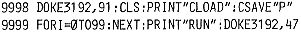 Folgende beiden Zeilen, an ein BASIC- Programm angehängt, erlauben auch in BASIC automatisches Laden und Starten eines Programms, ähnlich dem Generate- Befehl in Nassys. Zum Abspeichern auf Cassette muß zuerst im Nassys der U- Befehl gegeben werden. Im BASIC wird dann das Programm mit RUN9998 abgespeichert.