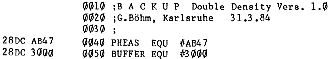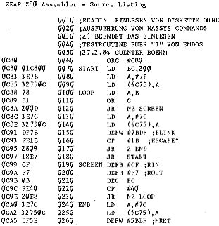 Im folgenden finden Sie ein Programm, das von der Diskette auf den Bildschirm liest. Es muß allerdings noch optimiert werden, da es nur 200 Bytes liest und dann auf einen Tastendruck wartet. (Dies, um nicht gleich mehrere Bildschirme hintereinander vollzuschreiben). Ich wollte mit der Cursoradresse (C29H) arbeiten, um festzustellen, wann der Bildschirm voll ist, aber mit EMDOS habe ich das auf die Schnelle nicht richtig in den Griff bekommen. Wer macht’s?