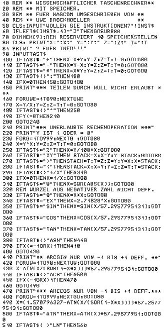 Auch dieses Programm hat einmal in der ‚Chip‘ gestanden.Es war urspruenglich fuer einen APPLE geschrieben und ich habe es lediglich fuer den Nascom angepasst.Es ist ganz interessant einen H P-Taschenrechner auf dem Bildschirm zu simulieren.Die Eingaben werden in sog. umgekehrter Polnischer Notation gemacht. Das heisst, zuerst Eingabe der Zahlen (immer mit NL abschliessen),Dann zuletzt die Funktion.